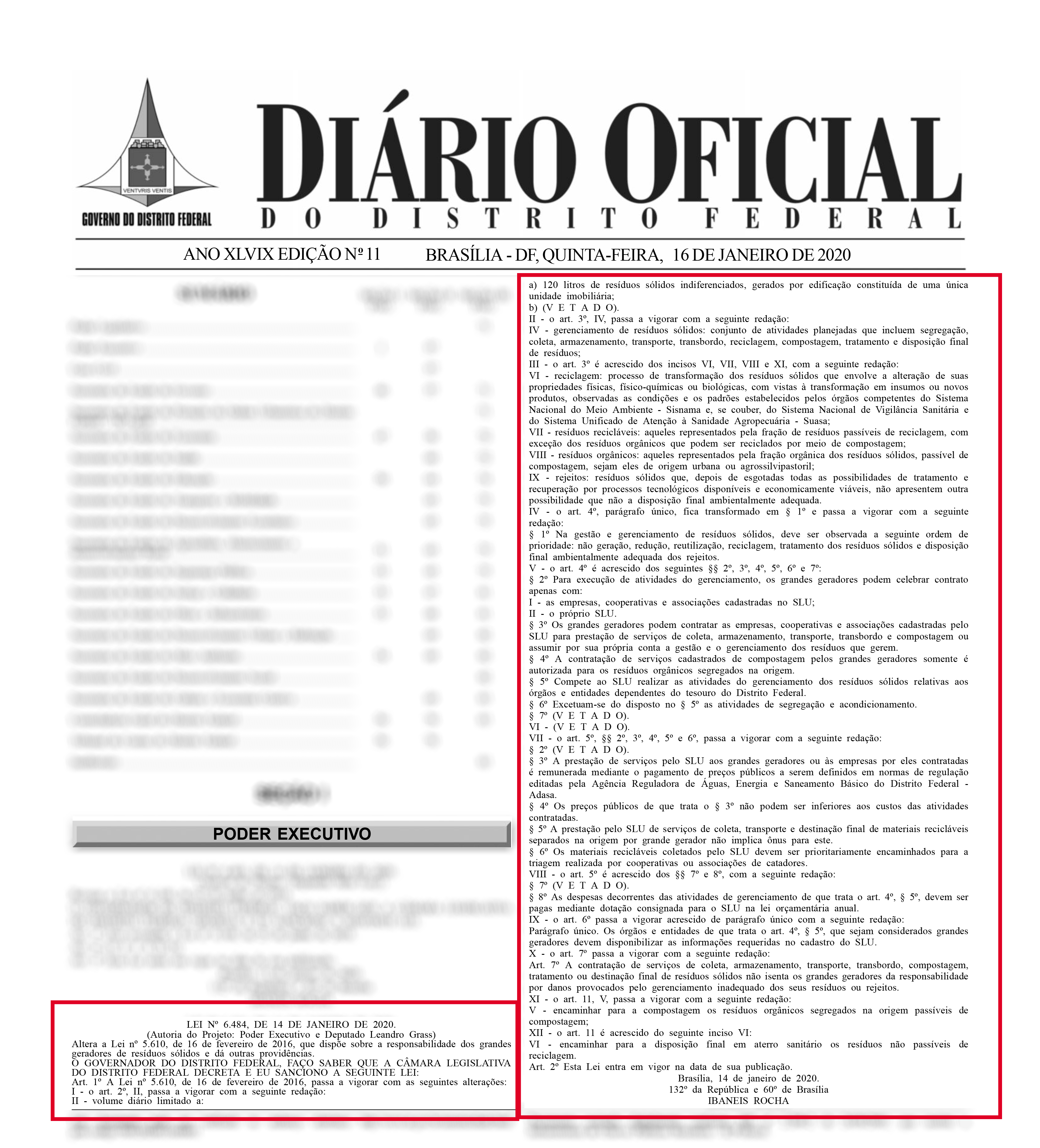 Lei nº 6.484/2020 – Altera a Lei nº 5.610, de 16 de fevereiro de 2016, que dispõe sobre a responsabilidade dos grandes geradores de resíduos sólidos e dá outras providências.