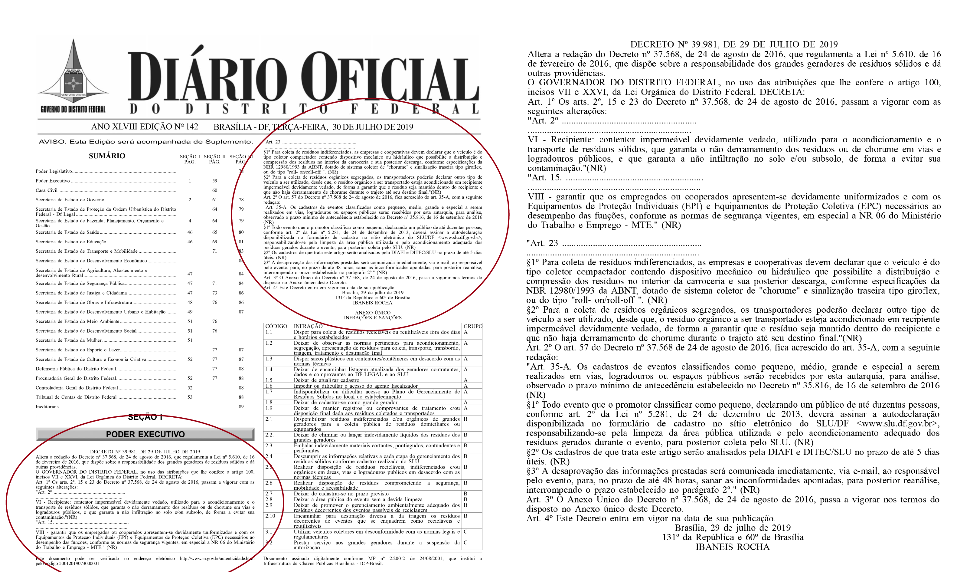 Decreto nº 39.981/2019 – Altera a redação do Decreto nº 37.568, de 24 de agosto de 2016, que regulamenta a Lei nº 5.610, de 16 de fevereiro de 2016, que dispõe sobre a responsabilidade dos grandes geradores de resíduos sólidos e dá outras providências.