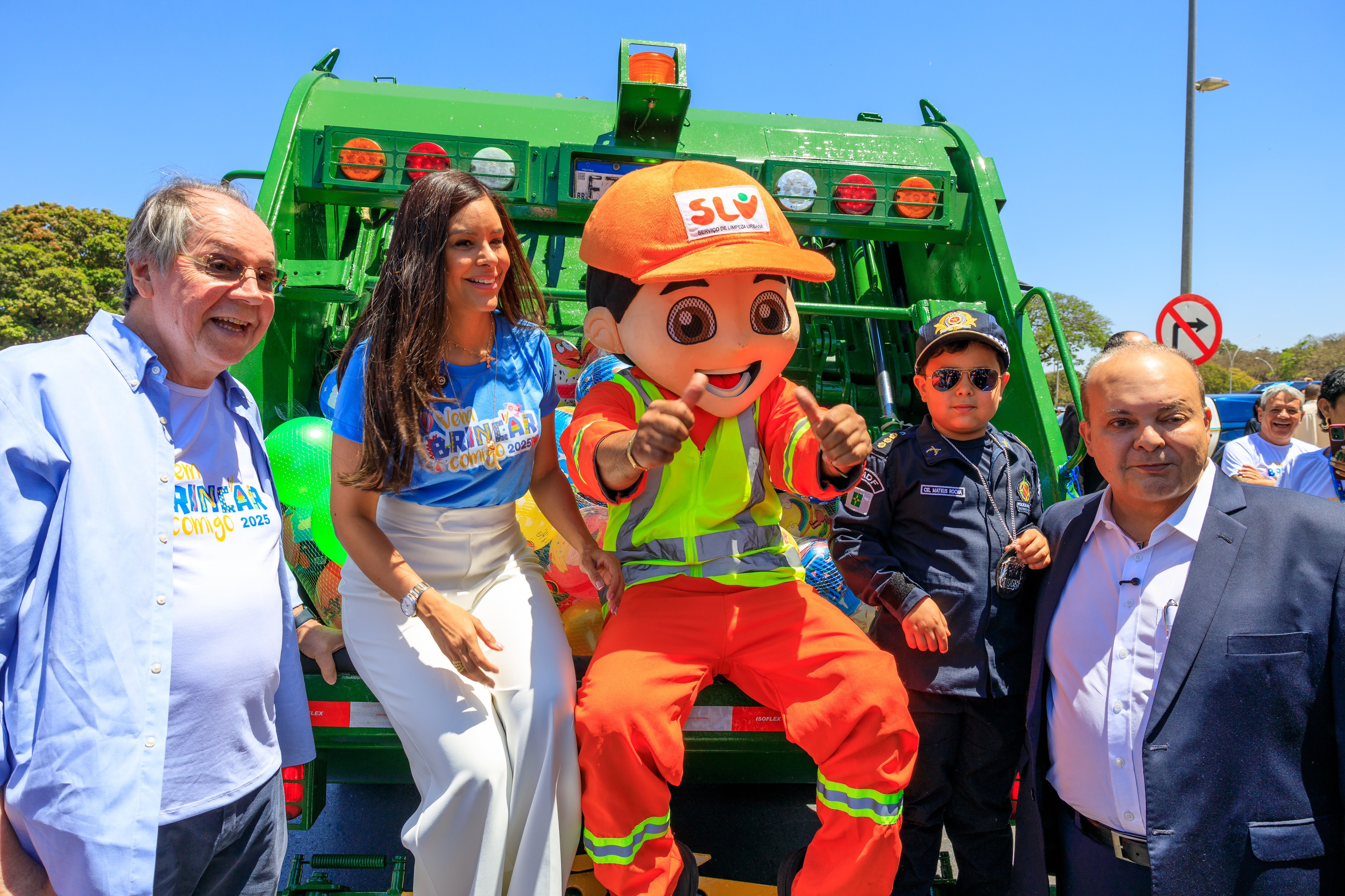 A grande atração foi o Garizito, mascote do SLU, que chegou em um caminhão de coleta carregado de brinquedos. A cena encantou o público e se tornou um dos momentos mais marcantes do dia, com o governador do Distrito Federal, Ibaneis Rocha, acompanhado da primeira-dama, Mayara Noronha, e do filho do casal, Mateus Rocha, no caminhão do SLU para registrar o momento, reforçando a importância da mobilização coletiva em favor da infância.